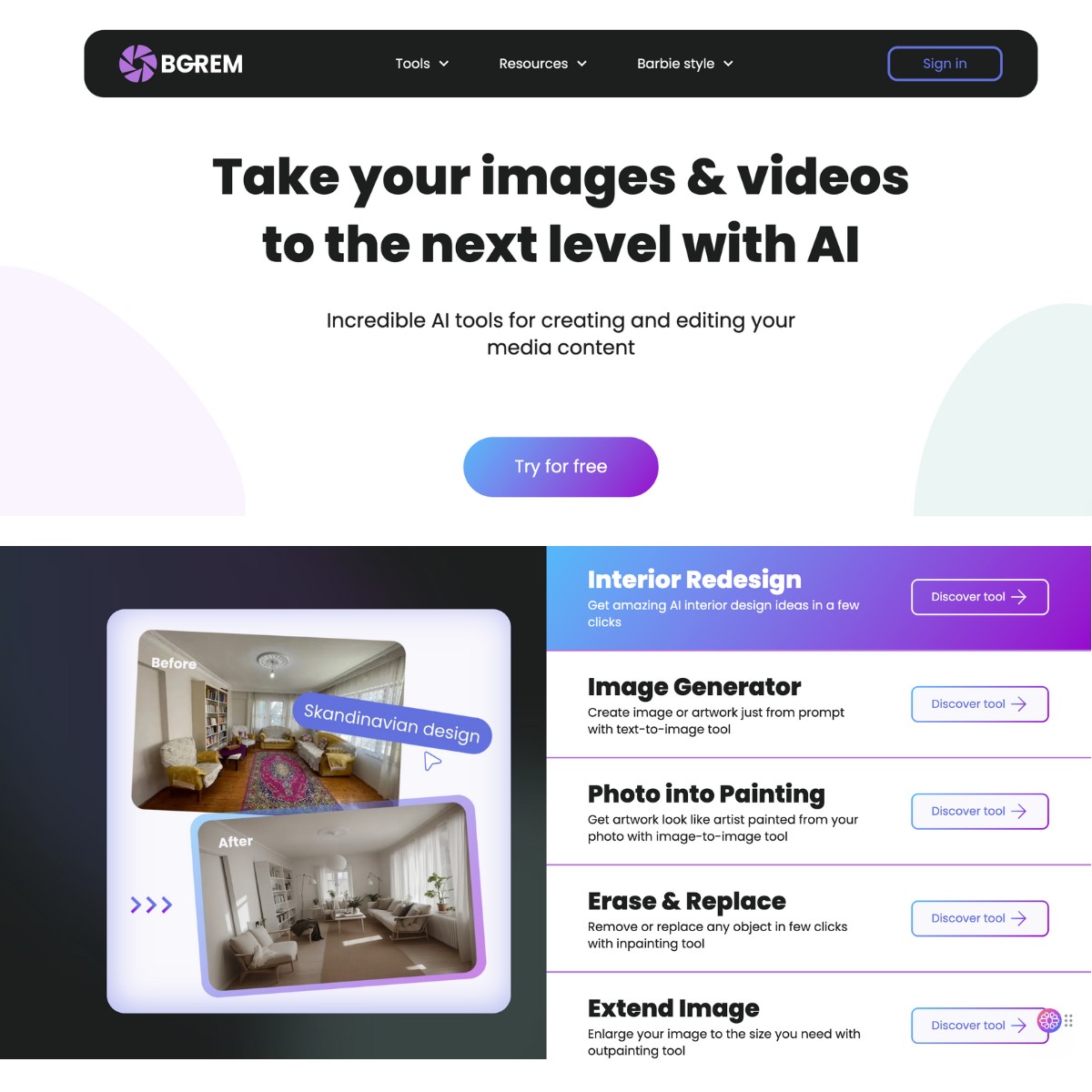 BgRem generates artwork from prompts, transforms photos into paintings, erases/replaces unwanted image elements, and expands images without detail loss. It’s suitable for creatives and works on all modern browsers.